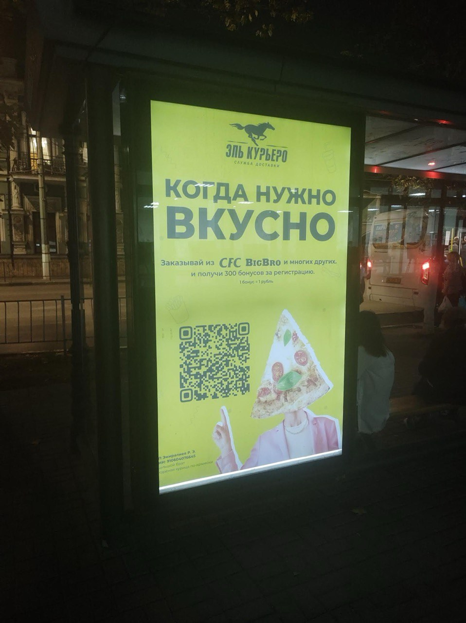 Стратегия: Размещение яркой и привлекательной рекламы в местах с высокой проходимостью, акцент на удобстве и быстроте доставки.